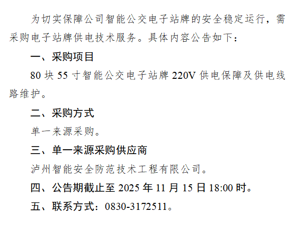 瀘州市公共交通集團(tuán)有限公司單一來(lái)源采購(gòu)公告