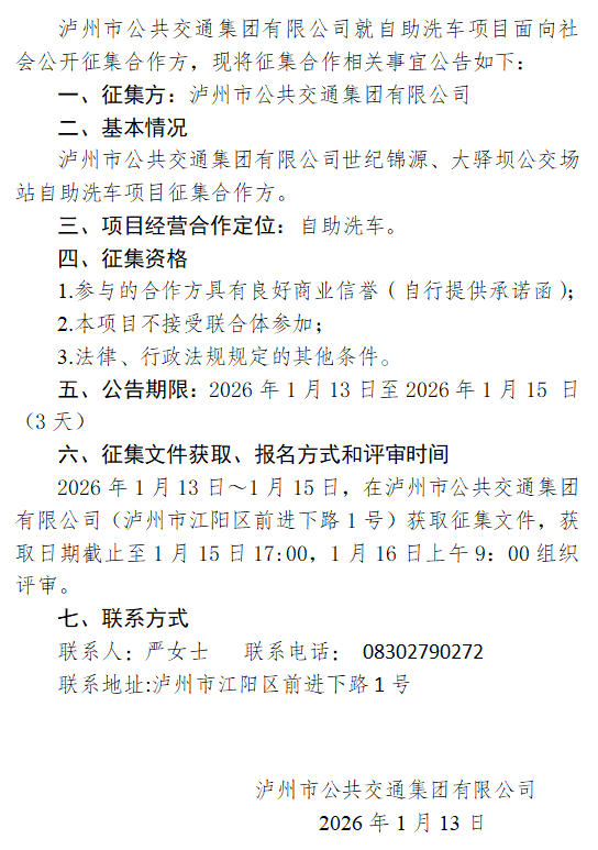 瀘州市公共交通集團有限公司自助洗車項目征集合作方的公告